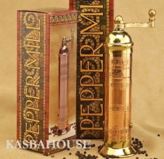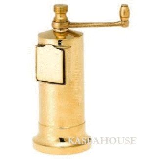 Cast brass pepper and spice mill / grinder. 5 Inches tall. Traditional hand crank design. Made in Greece.