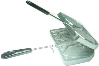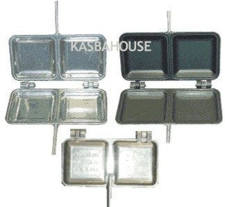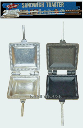 Square aluminum sandwich toasters seal all the ingredients in 2 slices of bread. They can be used on any outdoor grill or fireplace. Designed to accomodate a standard slice of bread. Castings are heavy to hold a steady heat. SHORT HANDLE models have an 18" overal length; LONG HANDLE models have a 26" overall length. Close iron to seal in ingredients and toast for approximately 3 minutes. Made in USA