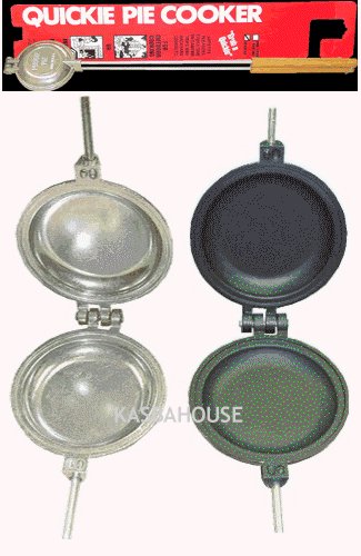 A pudgie pie maker is the ultimate tool for making toasted cheese sandwiches. Two circular, concave iron forms are hinged together, each half equipped with a handle to facilitate sticking it in a campfire or over a stove burner. Choose between regular or non stick coating. Short handle 18" overall (weighs only 15oz.)or long handle 26" overall. Made in the USA