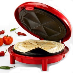 Cooks quesadillas in 4 to 5 minutes Fits tortillas up to 12 inches in diameter Nonstick cooking plates wipe clean; built-in drip tray Power and ready light; cool touch housing; steam guard. Includes recipes; 1-year limited warranty For a quick and easy meal, this festive red machine fires up quesadillas filled with grilled veggies, barbecued chicken, or just plain old cheese in under five minutes. The cooking plates fit tortillas that are up to 12 inches in diameter and divide your quesadilla into six manageable sections during pressing. A power light illuminates when the unit is plugged in and a ready light lets you know when your quesadilla is done. The metal cooking plates are coated with nonstick Teflon so quesadillas lift easily out of the maker and cleanup is even quicker than cooking time. The maker also has a built-in drip tray that catches stray bits of melted cheese and filling ingredients. The quesadilla maker's handle stays cool to the touch for safe handling. The Salton quesadilla maker comes with its own recipe book and is covered by a one-year limited manufacturer's warranty.