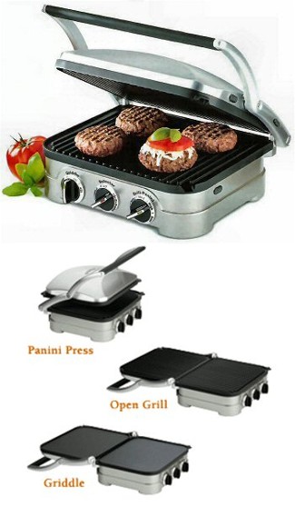 The Cuisinart Griddler is a terrific multifunction appliance that does the job of several appliances. There are 4 different cooking options: A contact grill, a Panini press, or the unit can act as a large, open double grill or griddle. Dual temperature controls insure even heat distribution and perfect results. Removable, dishwasher safe nonstick grill and griddle plates Cooking plates are designed to drain grease for healthier cooking Sturdy panini-style handle with floating hinge to adjust to thickness of foodBrushed stainless steel housing Comes with dishwasher safe scraping tool and drip cups, plus a spiral bound 40-recipe cookbook. The Cuisinart Griddler has a 3 year warranty from Cuisinart. Approximate dimensions: 12" x 9.5" x 12.5". Grilling surface, about 11 1/2" x 9"