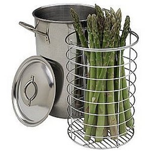 SOLD OUT/DISCONTINUED Tall, slender pot cooks asparagus evenly to tender perfection by holding it upright. Basket included. 10" high. R839