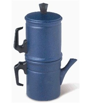 3/4 cup size. These Neapolitan Italian Stovetop Espresso Makers brew by the drip method. Once the water boils, simply turn the pot upside down. The water will drip from the upper chamber and seep through the grounds into the lower chamber. Blue aluminum. Made in Italy