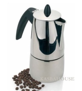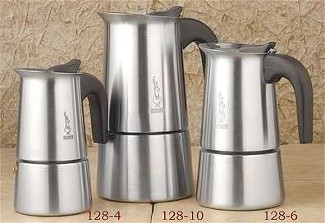 -DISCONTINUED-Stovetop espresso maker; safe for induction cooktops; it comes with a variable funnel which allows you to make half of the coffee inthe same pot without having to throw what you will not drink! Anti-heat Bakelite handle. stainless steel Made in Spain