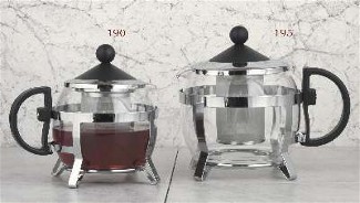 Glass Tea Servers with built-in infusor. This unique item features a tempered glass bowl with a stainless steel frame and infusor for brewing. Simply unscrew the infusor and pack loose or bagged tea. the handy lever allows you to raise and lock the infusor out of sight after use. Chrome finish. Replacement glass available, hand wash only.